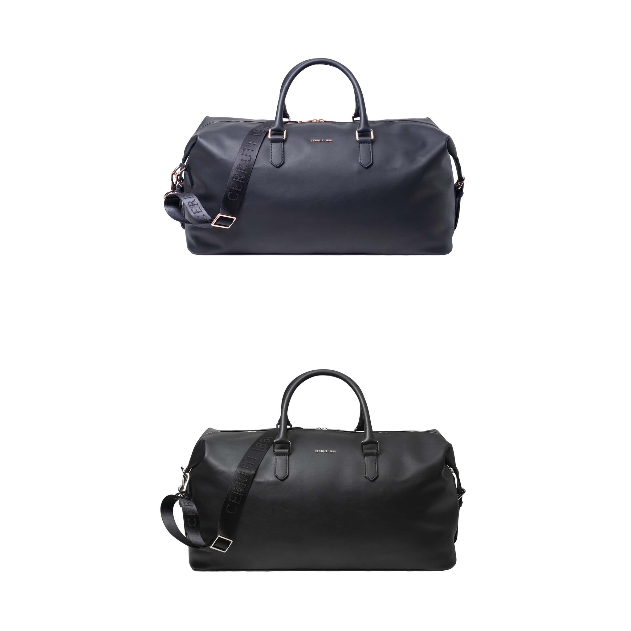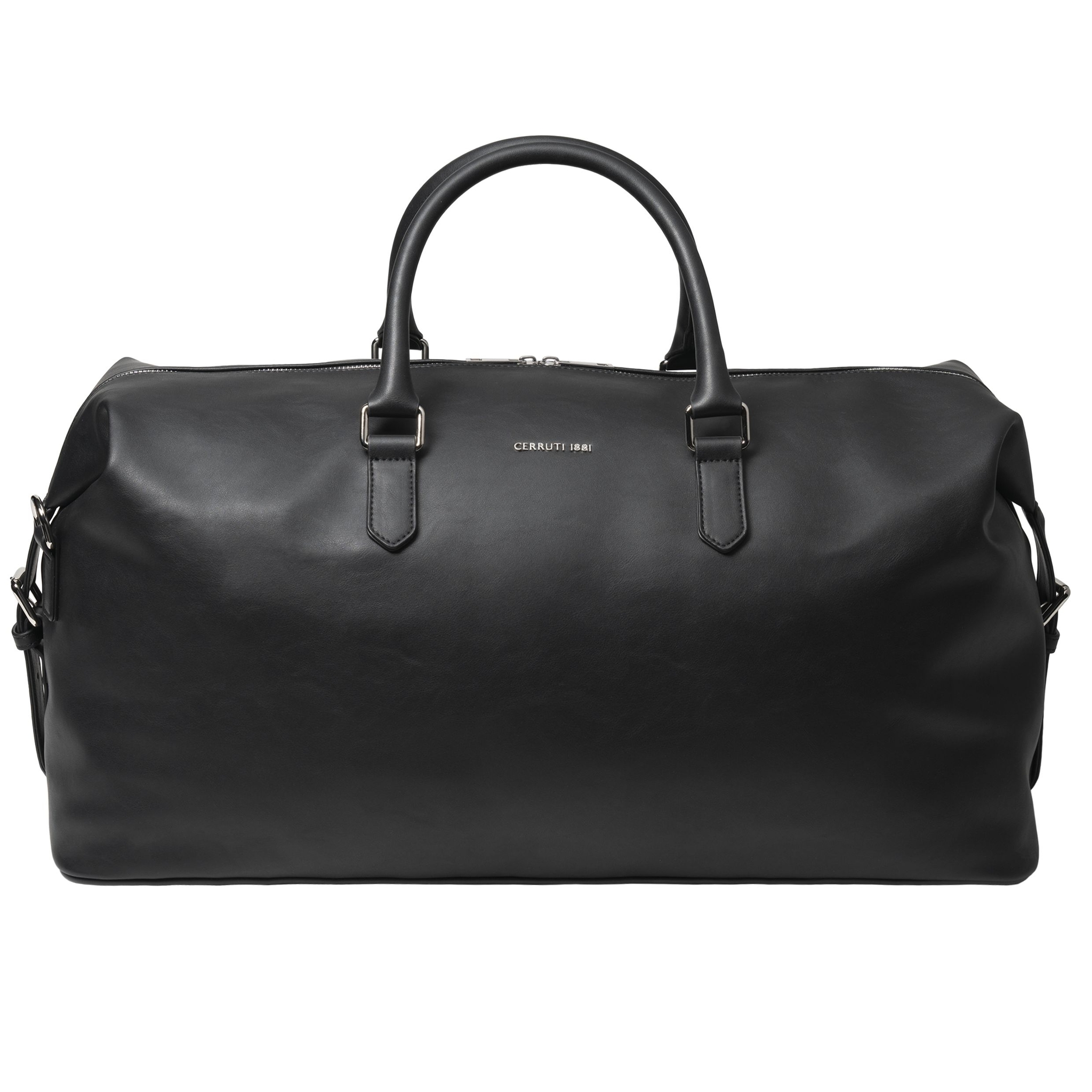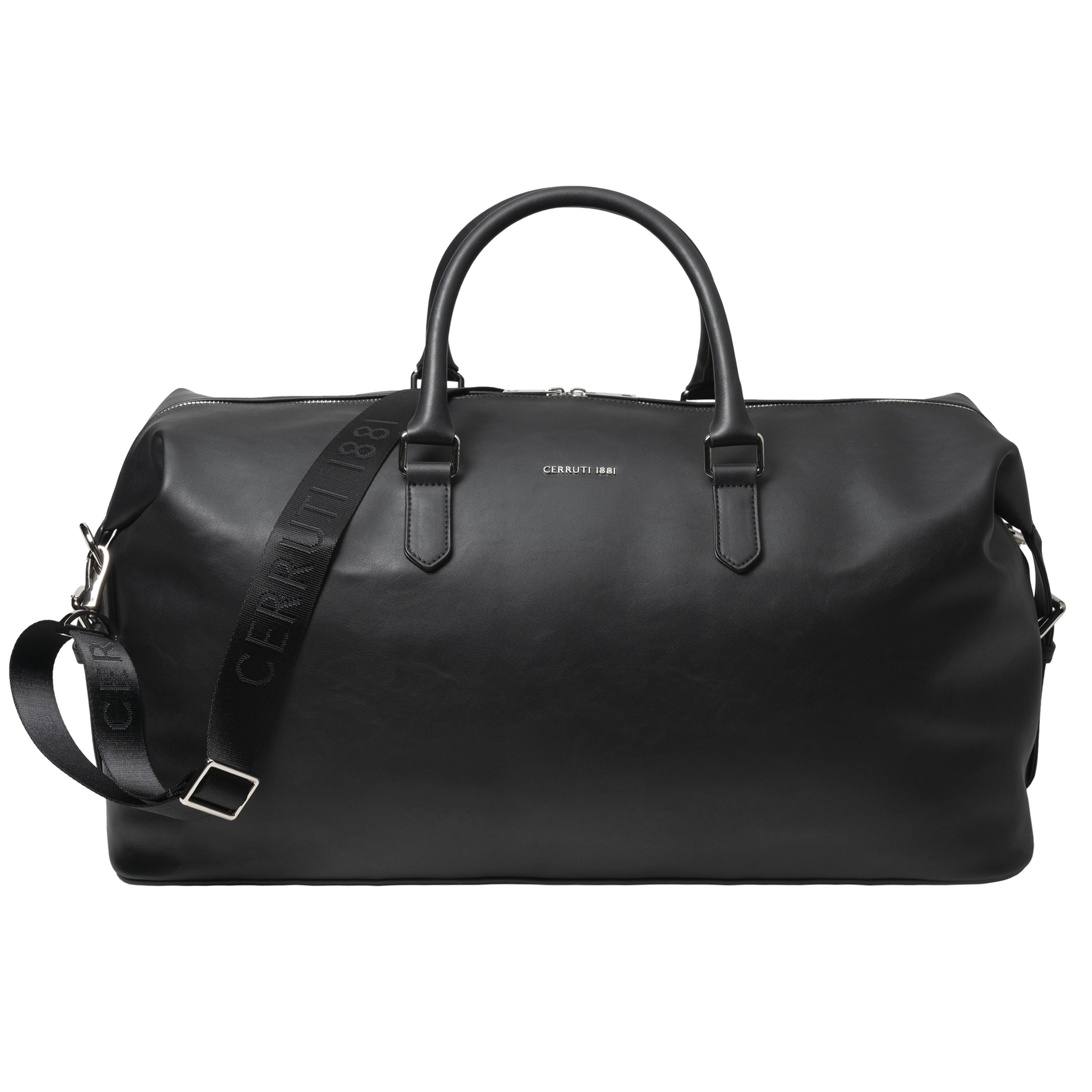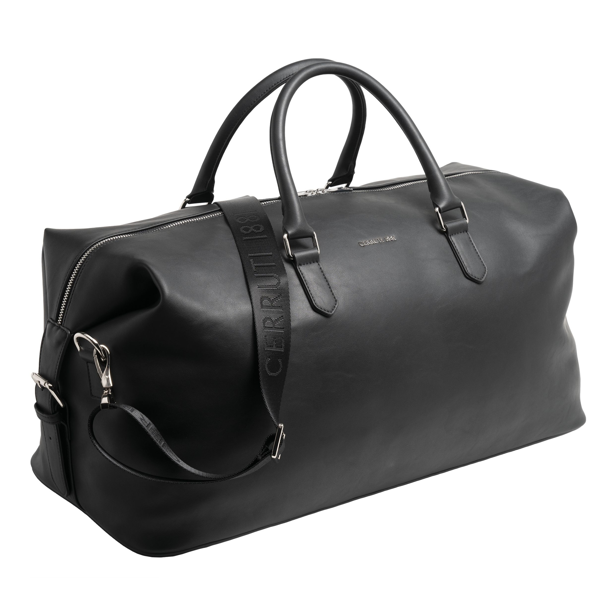 Сумка выходного дня «Zoom» с минималистичным дизайном и современным стилем изготовлена из гладкого и легкого черного материала с блестящей хромированной металлической отделкой.