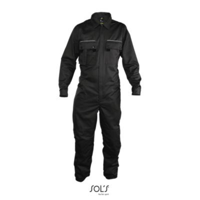РАБОЧИЙ КОМБИНЕЗОН С ДВОЙНОЙ МОЛНИЕЙ. 10 карманов; карманы с клапанами со светоотражающей полосой; специальные карманы для наколенников; эластичная стягивающая вставка на поясе сзади; молния с двусторонним бегунком;; специальная этикетка для указания персональных данных, вышитая внутри