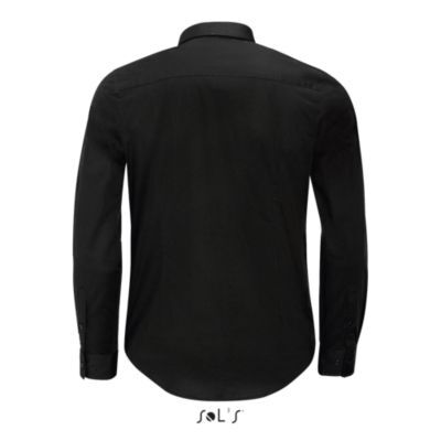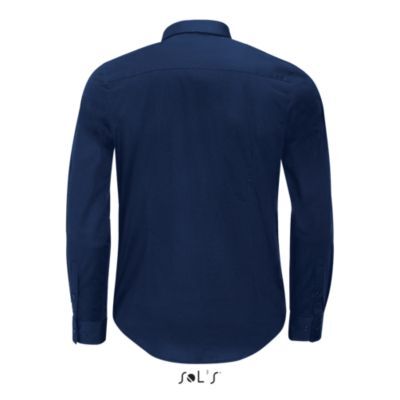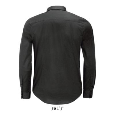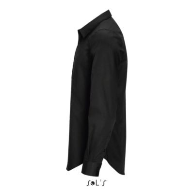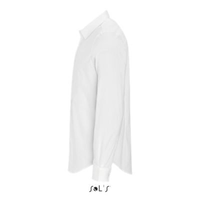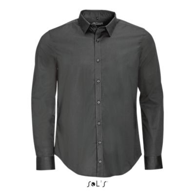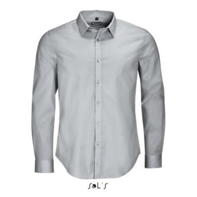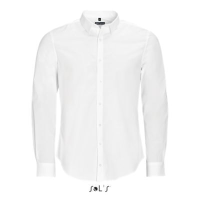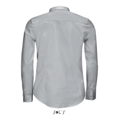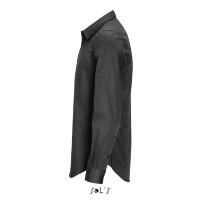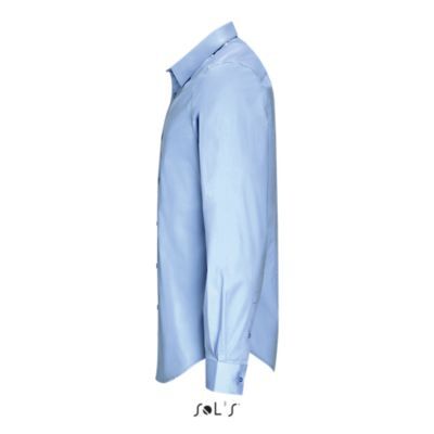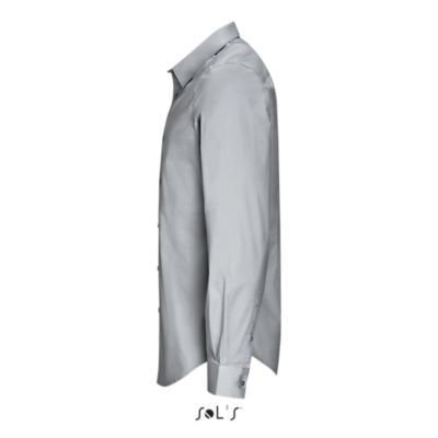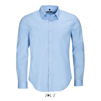 РУБАШКА МУЖСКАЯ ИЗ ТКАНИ СТРЕТЧ С ДЛИННЫМ РУКАВОМ. Зауженный крой; Длинный рукав; Современный классический воротник; Манжеты на 2 пуговицах и разрез рукава "капуцин"; Планка с 8 пуговицами в цвет изделия; 2 вытачки на уровне пояса на спине