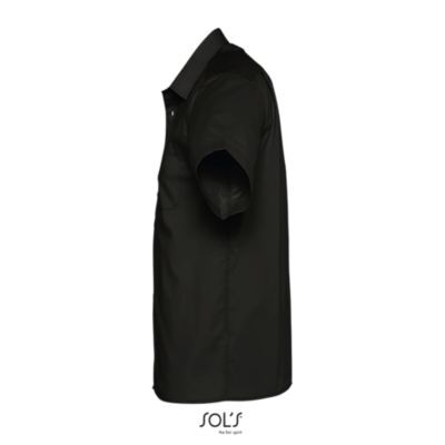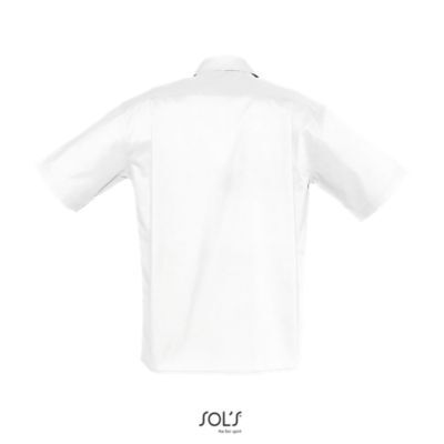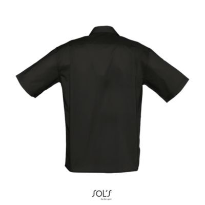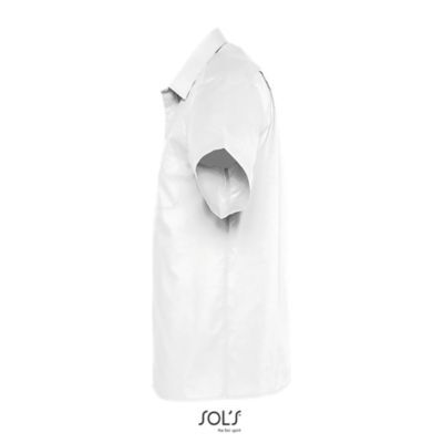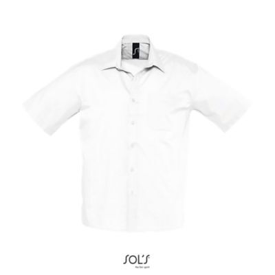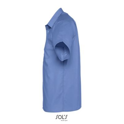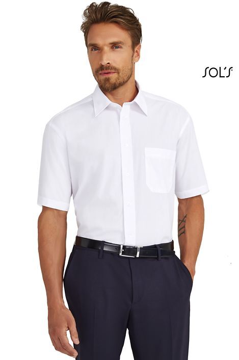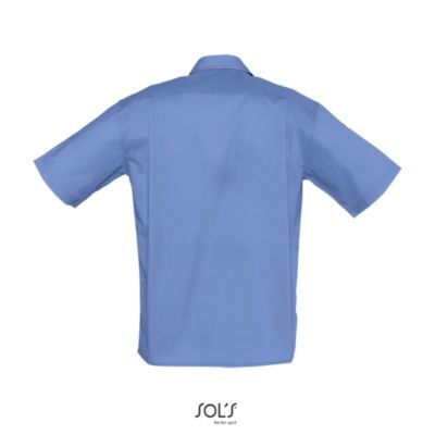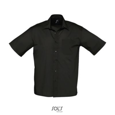 РУБАШКА МУЖСКАЯ ИЗ ПОПЛИНА С КОРОТКИМ РУКАВОМ. Прямой крой; Короткий рукав; Жесткий воротник; Планка с 7 пуговицами в цвет изделия; Нагрудный карман слева; 2 складки на спине для свободы движений