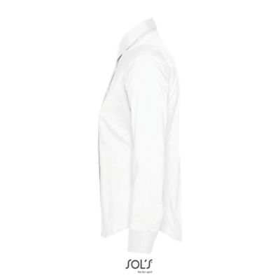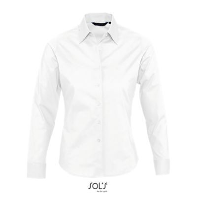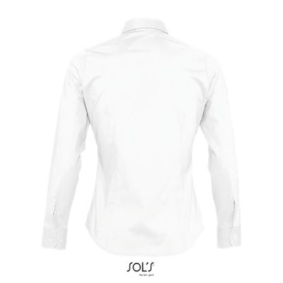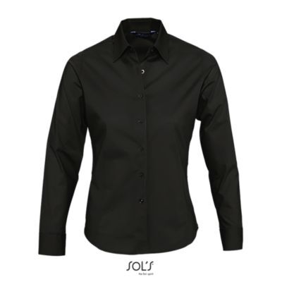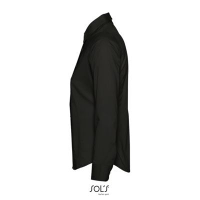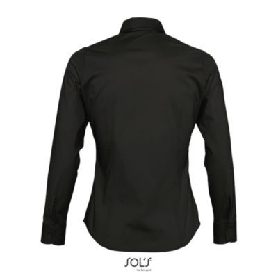 РУБАШКА ЖЕНСКАЯ ИЗ ТКАНИ СТРЕЙЧ С ДЛИННЫМ РУКАВОМ. Приталенная модель; Длинный рукав; Воротник на одной пуговице; Регулируемые манжеты на 2 пуговицах и разрез рукава "капуцин"; Планка с 7 пуговицами в цвет изделия; Вытачки спереди и на спине