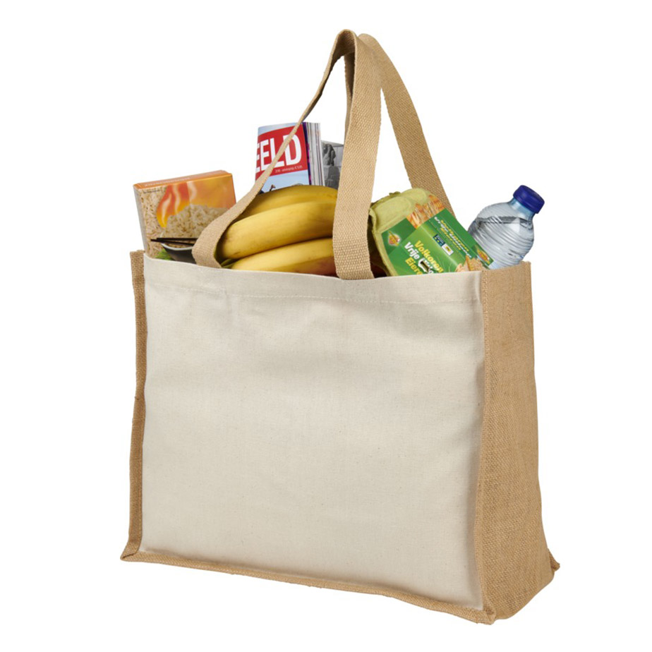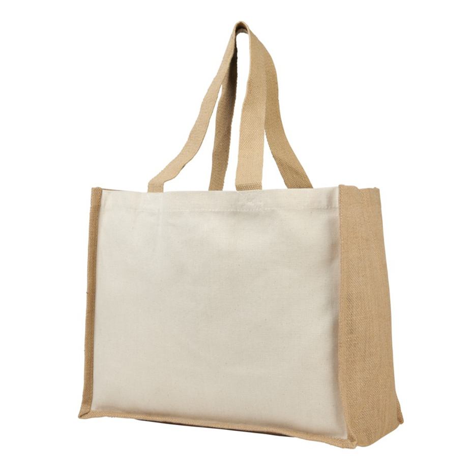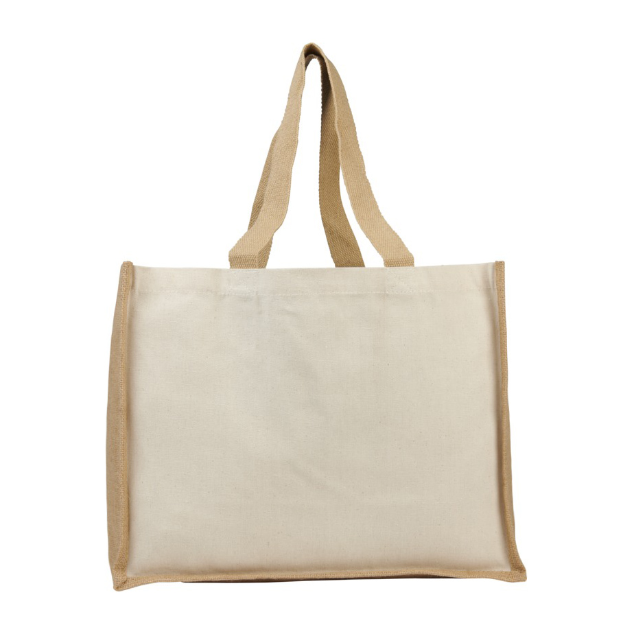 Модная сумка для покупок с боковыми панелями (вес 320 г/м²), подходящими для нанесения изображений, окантовкой из ламинированного джута и хлопковыми ручками.