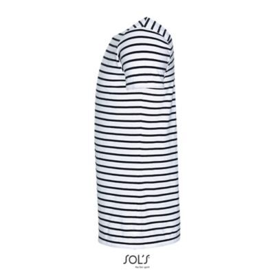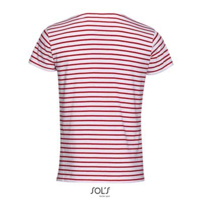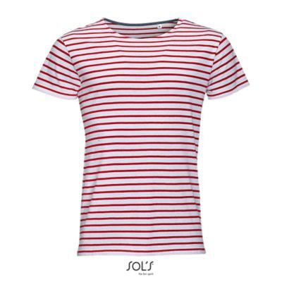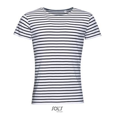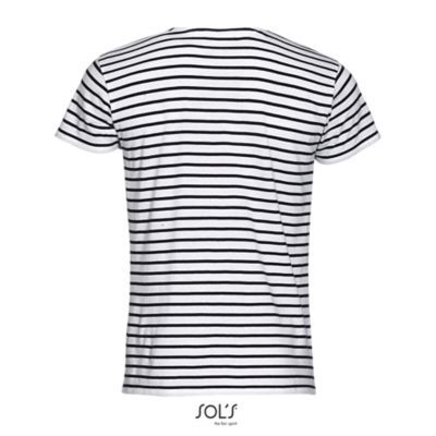 МУЖСКАЯ ФУТБОЛКА С КРУГЛЫМ ВОРОТОМ В ПОЛОСКУ. Короткие рукава; Приталеная модель; Сшито из кроеного полотна; Контрастные детали в стиле деним по внутренней стороне ворота